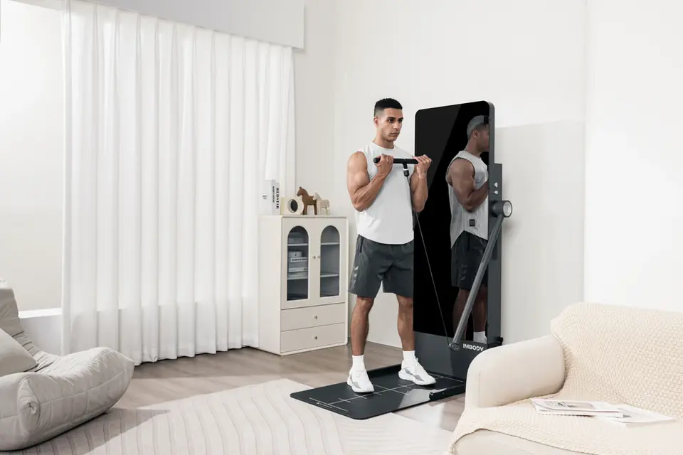 - 43-Zoll Smart Mirror mit KI-gestütztem Coaching - Hinter dem edlen Spiegel verbirgt sich ein hochauflösender Bildschirm, der über 1000 interaktive Workouts mit Echtzeit-Feedback und KI-Analyse bereitstellt.